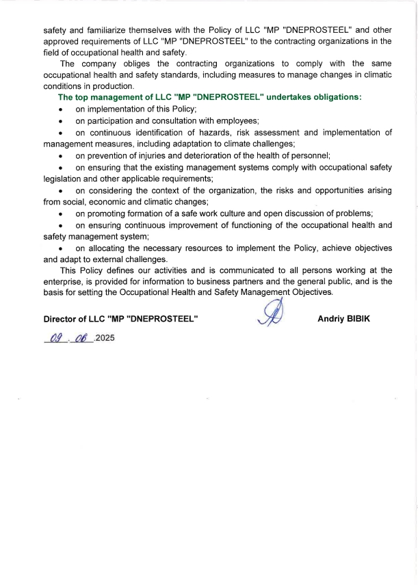 Policy in the field of occupational health and safety management of LLC "MP "DNEPROSTEEL"