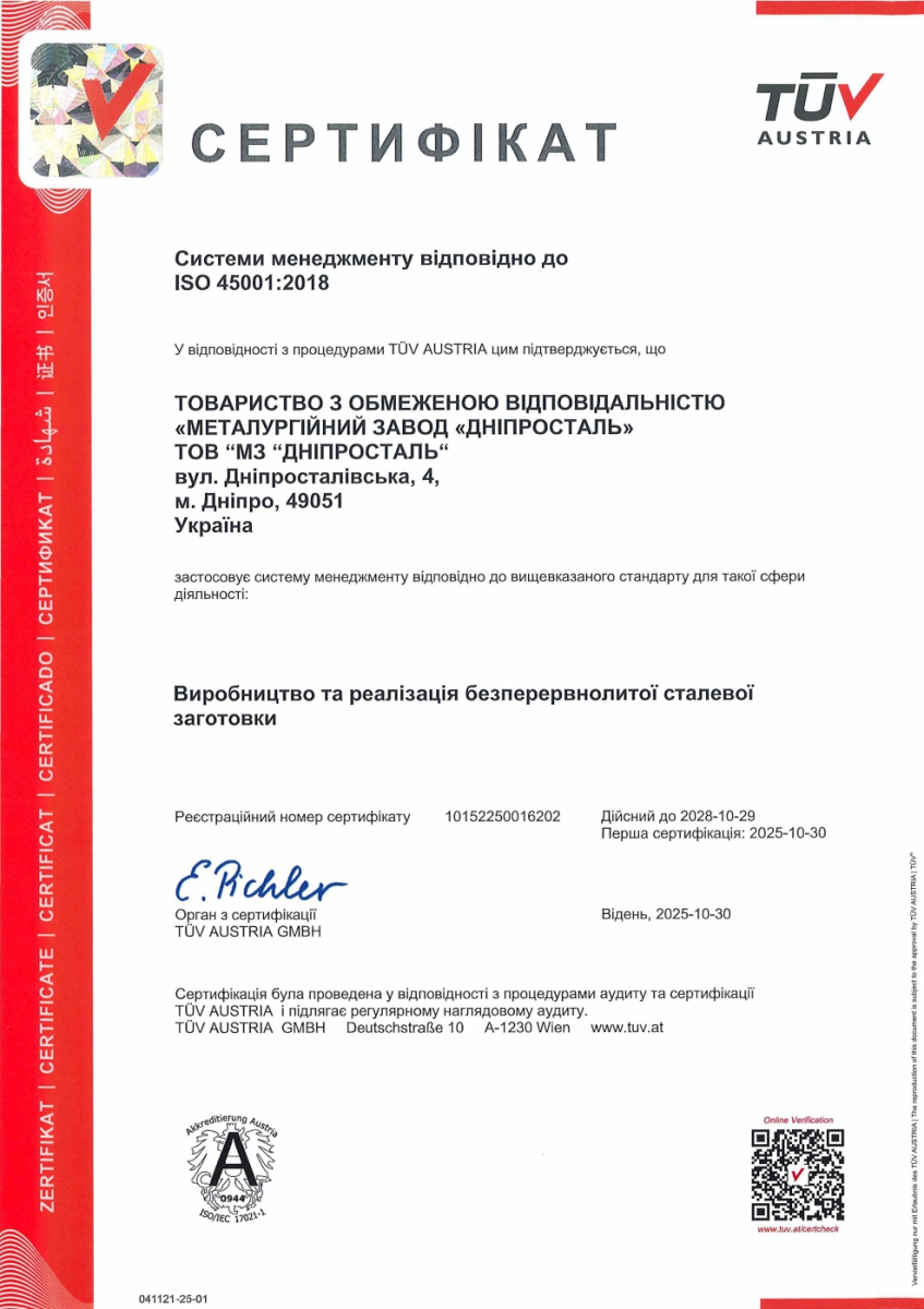 Сертифікат системи менеджменту відповідно до ISO 45001:2018