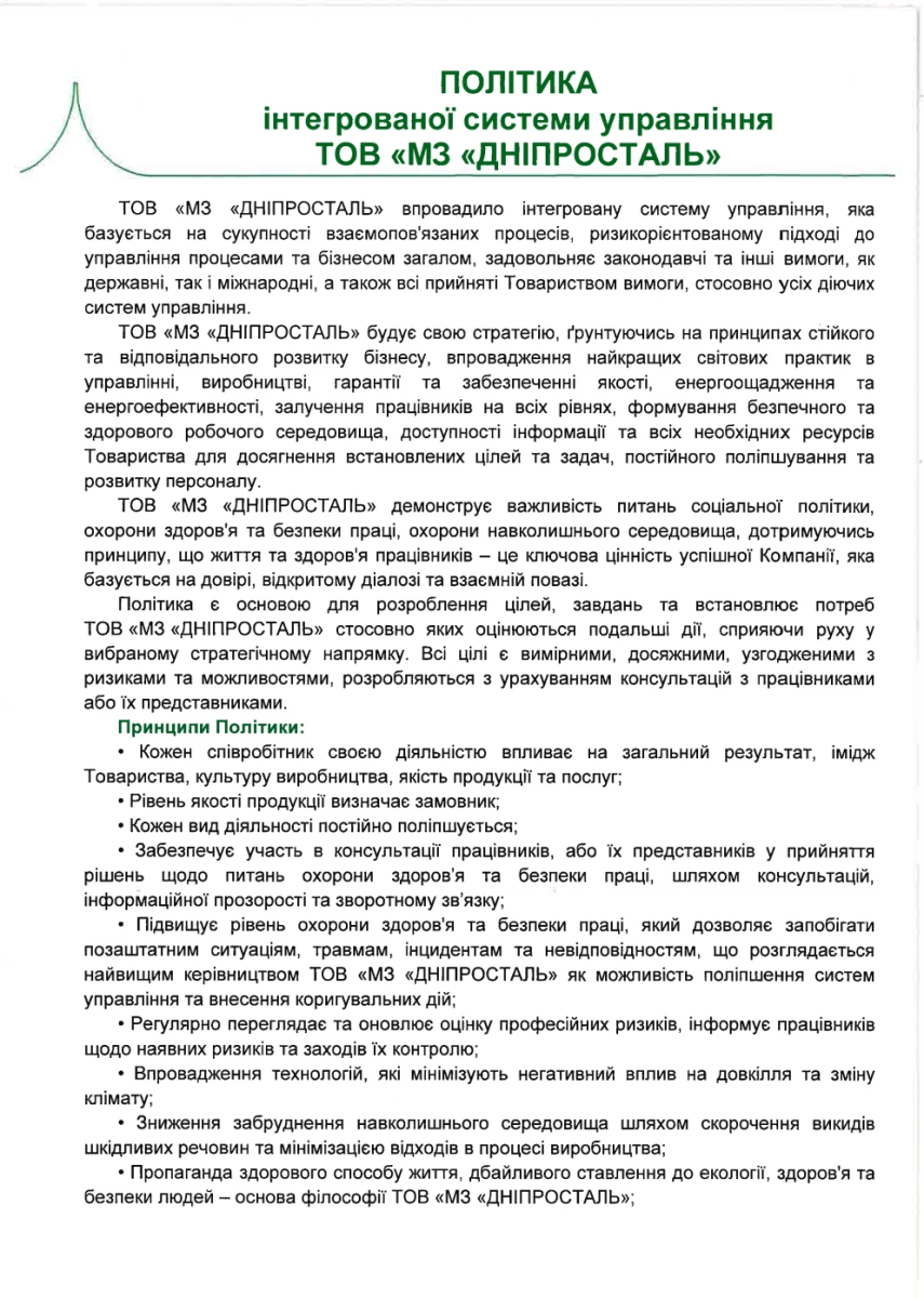 Політика інтегрованої системи управління ТОВ «МЗ «ДНІПРОСТАЛЬ»