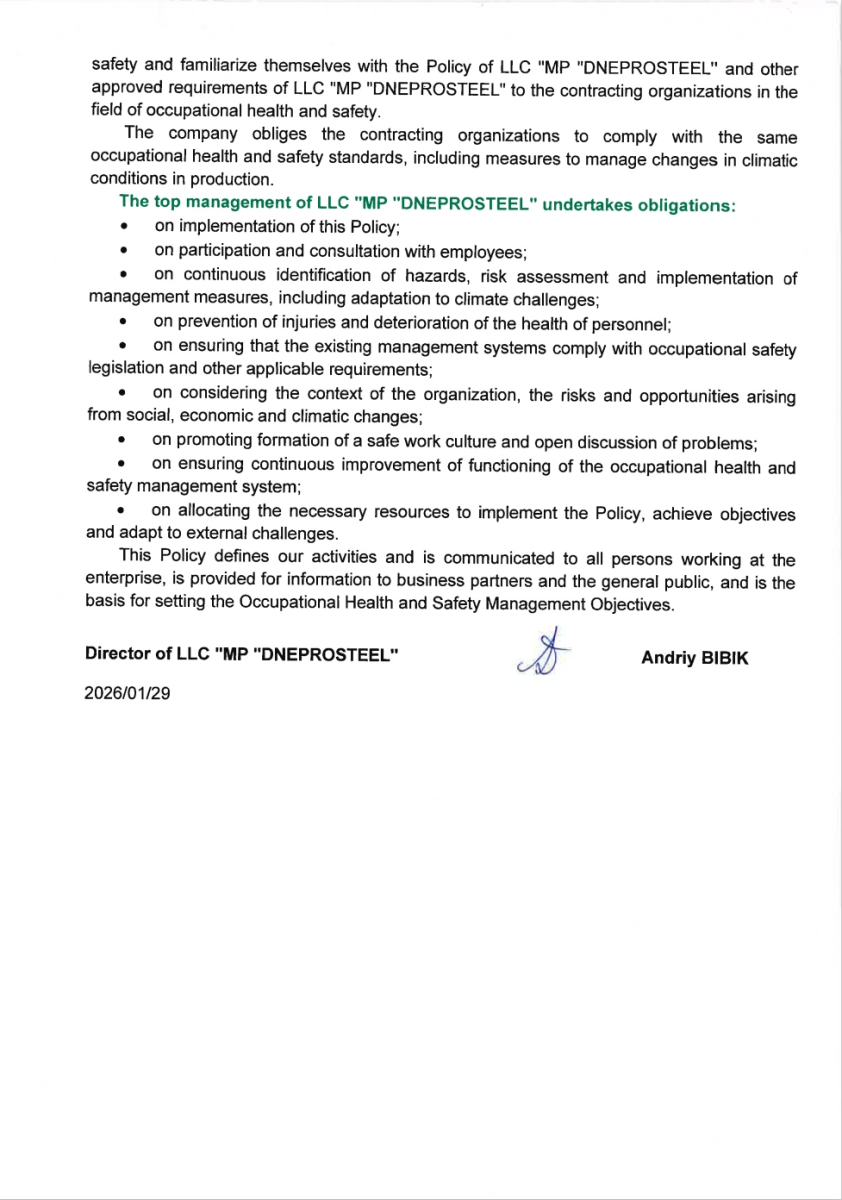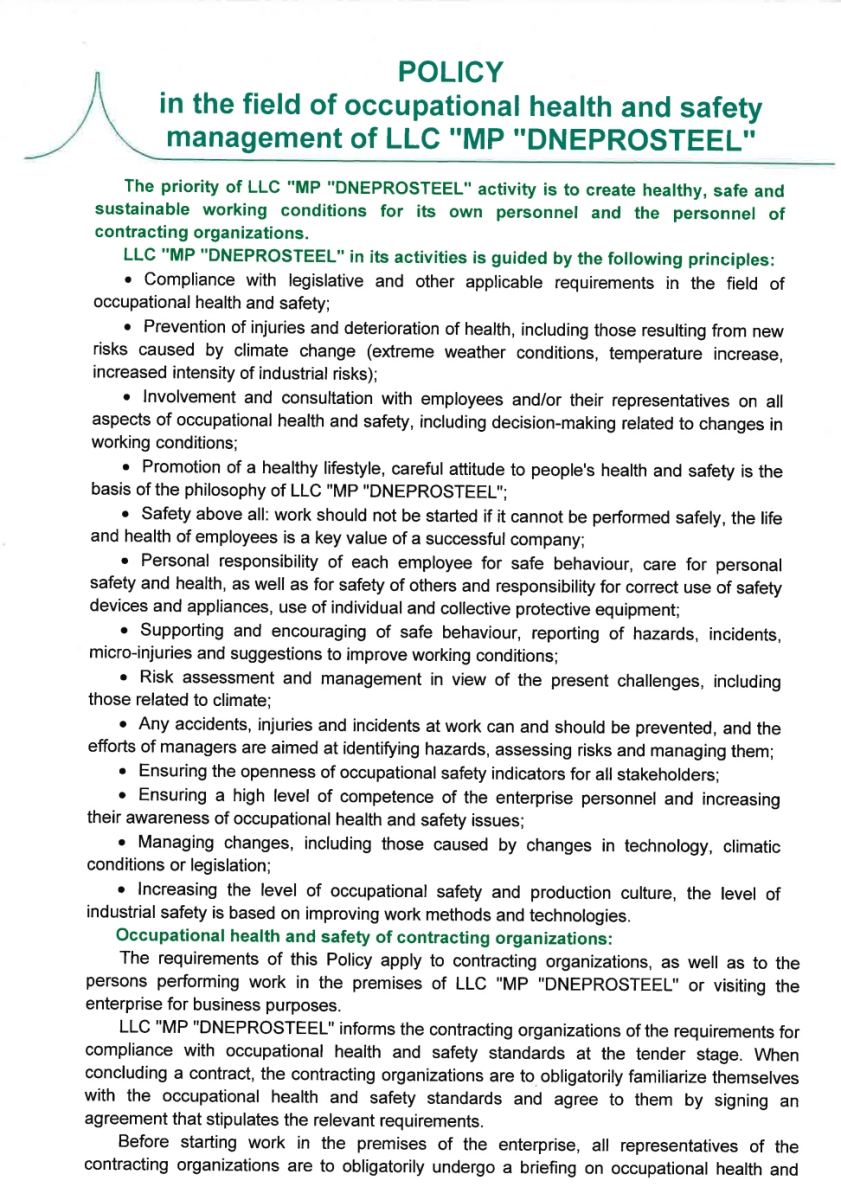 Policy in the field of occupational health and safety management of LLC "MP "DNEPROSTEEL"